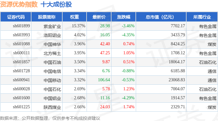 资源优势(399319)指数十大成份股详情如下: