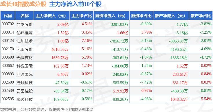 资金流向方面,成长40(399326)指数成份股当日主力资金净流出合计28.34亿元,游资资金净流入合计11.23亿元,散户资金净流入合计17.12亿元。成份股资金流向详情见下表: