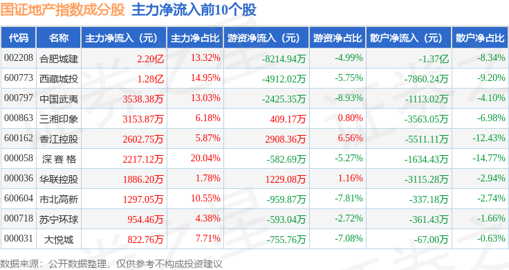 资金流向方面,国证地产(399393)指数成份股当日主力资金净流出合计2.71亿元,游资资金净流入合计2012.86万元,散户资金净流入合计2.51亿元。成份股资金流向详情见下表:
