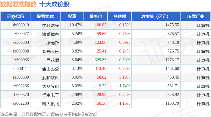 证券之星消息,11月17日,数据要素(399418)指数报收于4234.05点,涨1.08%,成交408.5亿元,换手率0.99%。当日该指数成份股中,上涨的有40家,三六零以10.01%的涨幅领涨,下跌的有9家,海康威视以2.71%的跌幅领跌。