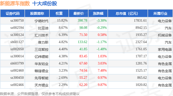 新能源车(399417)指数十大成份股详情如下: