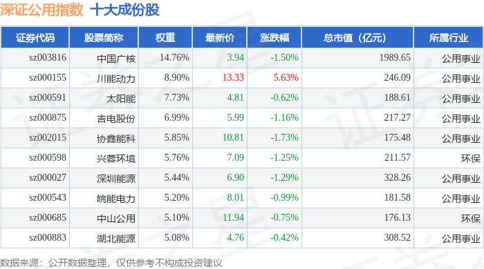 证券之星消息,11月17日,深证公用(399622)指数报收于1794.09点,跌0.49%,成交53.74亿元,换手率0.8%。当日该指数成份股中,上涨的有2家,川能动力以5.63%的涨幅领涨,下跌的有17家,甘肃能源以2.55%的跌幅领跌。