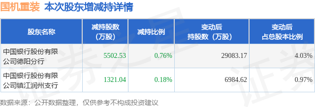 证券之星消息,11月17日国机重装发布公告《国机重装:国机重型装备集团股份有限公司简式权益变动报告书》,其股东中国银行股份有限公司德阳分行、中国银行股份有限公司镇江润州支行于2025年11月11日至2025年11月14日间合计减持6823.57万股,占公司目前总股本的0.9459%,变动期间该股股价下跌2.71%,截止11月14日收盘报3.59元。