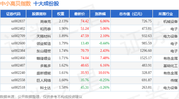 证券之星消息,11月17日,中小高贝(399664)指数报收于1477.95点,涨1.38%,成交1182.26亿元,换手率3.28%。当日该指数成份股中,上涨的有58家,盛新锂能以10.01%的涨幅领涨,下跌的有41家,凯莱英以2.74%的跌幅领跌。