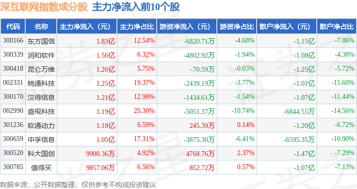 资金流向方面,深互联网(399675)指数成份股当日主力资金净流入合计15.23亿元,游资资金净流出合计6.48亿元,散户资金净流出合计8.75亿元。成份股资金流向详情见下表: