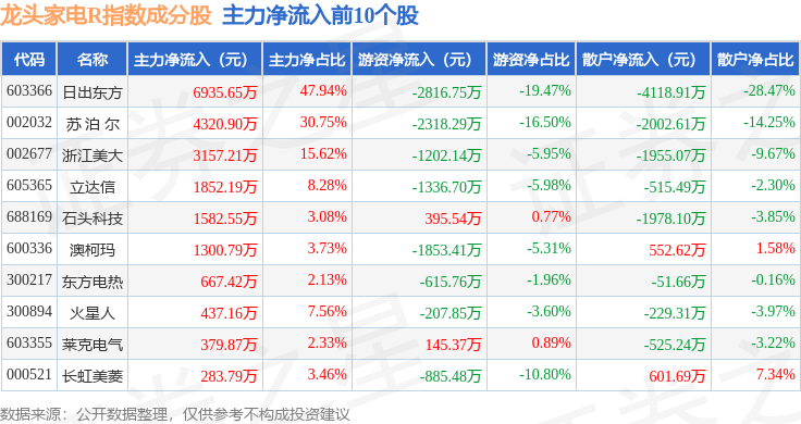资金流向方面,龙头家电R(480028)指数成份股当日主力资金净流出合计10.41亿元,游资资金净流入合计2.35亿元,散户资金净流入合计8.05亿元。成份股资金流向详情见下表: