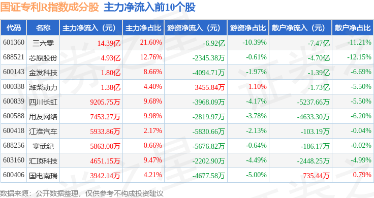 资金流向方面,国证专利R(480070)指数成份股当日主力资金净流出合计68.07亿元,游资资金净流入合计18.81亿元,散户资金净流入合计49.25亿元。成份股资金流向详情见下表: