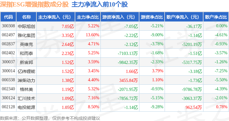 资金流向方面,深指ESG增强(970032)指数成份股当日主力资金净流出合计104.86亿元,游资资金净流入合计24.93亿元,散户资金净流入合计79.92亿元。成份股资金流向详情见下表: