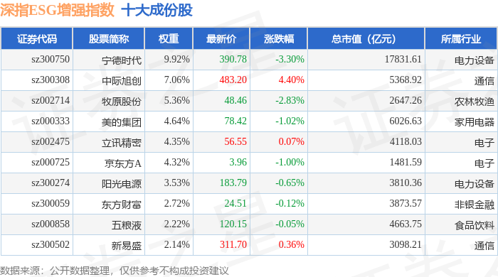 证券之星消息,11月17日,深指ESG增强(970032)指数报收于1536.37点,跌0.54%,成交2336.21亿元,换手率1.27%。当日该指数成份股中,上涨的有64家,雅化集团以10.0%的涨幅领涨,下跌的有134家,迈为股份以6.71%的跌幅领跌。