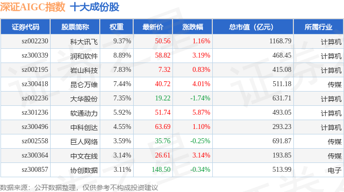 深证AIGC(970075)指数十大成份股详情如下: