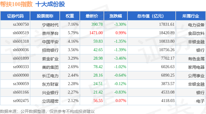 证券之星消息,11月17日,帮扶100(980065)指数报收于2156.81点,跌0.94%,成交1883.02亿元,换手率0.36%。当日该指数成份股中,上涨的有22家,盐湖股份以6.36%的涨幅领涨,下跌的有76家,洛阳钼业以4.35%的跌幅领跌。
