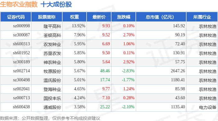 生物农业(980072)指数十大成份股详情如下: