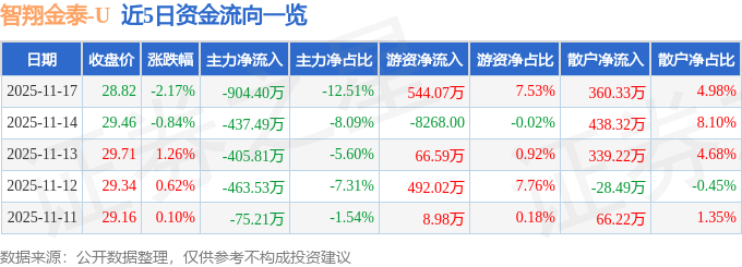 证券之星消息,截至2025年11月17日收盘,智翔金泰(688443)报收于28.82元,下跌2.17%,换手率2.14%,成交量2.49万手,成交额7228.93万元。