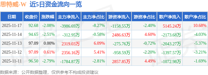 11月17日的资金流向数据方面,主力资金净流出3986.69万元,占总成交额8.27%,游资资金净流出1158.55万元,占总成交额2.4%,散户资金净流入5145.24万元,占总成交额10.68%。