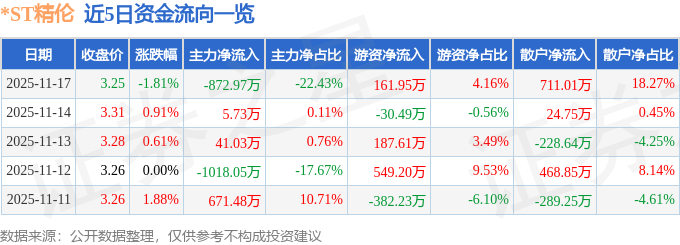 证券之星消息,截至2025年11月17日收盘,*ST精伦(600355)报收于3.25元,下跌1.81%,换手率2.42%,成交量11.92万手,成交额3892.22万元。