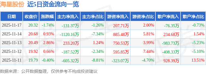 证券之星消息,截至2025年11月17日收盘,海星股份(603115)报收于20.32元,下跌1.74%,换手率2.1%,成交量5.09万手,成交额1.04亿元。