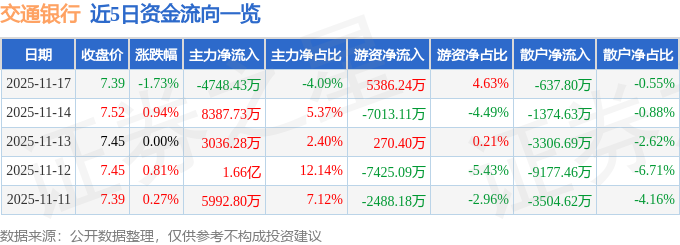 证券之星消息,截至2025年11月17日收盘,交通银行(601328)报收于7.39元,下跌1.73%,换手率0.6%,成交量156.66万手,成交额11.62亿元。