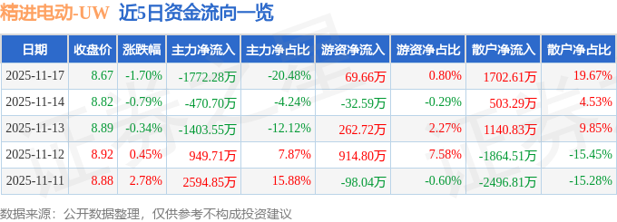 证券之星消息,截至2025年11月17日收盘,精进电动(688280)报收于8.67元,下跌1.7%,换手率1.91%,成交量9.92万手,成交额8655.62万元。