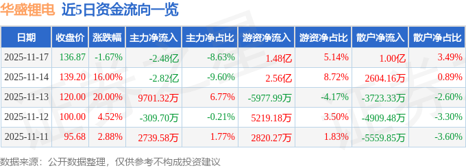 证券之星消息,截至2025年11月17日收盘,华盛锂电(688353)报收于136.87元,下跌1.67%,换手率17.8%,成交量21.2万手,成交额28.7亿元。