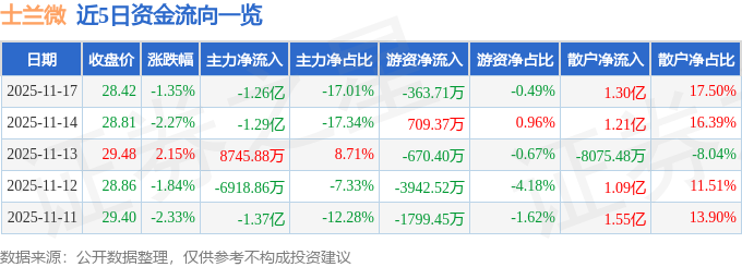 证券之星消息,截至2025年11月17日收盘,士兰微(600460)报收于28.42元,下跌1.35%,换手率1.56%,成交量25.9万手,成交额7.41亿元。