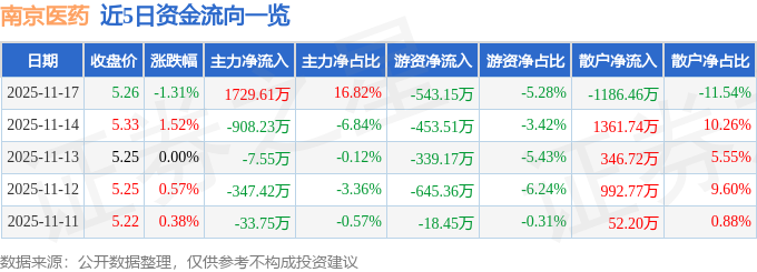 证券之星消息,截至2025年11月17日收盘,南京医药(600713)报收于5.26元,下跌1.31%,换手率1.51%,成交量19.43万手,成交额1.03亿元。
