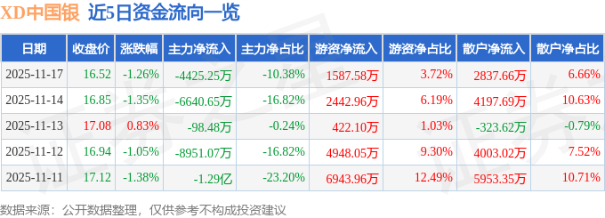 证券之星消息,截至2025年11月17日收盘,XD中国银(601881)报收于16.52元,下跌1.26%,换手率0.36%,成交量25.74万手,成交额4.26亿元。