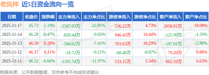 证券之星消息,截至2025年11月17日收盘,老凤祥(600612)报收于45.73元,下跌1.19%,换手率0.78%,成交量2.47万手,成交额1.13亿元。