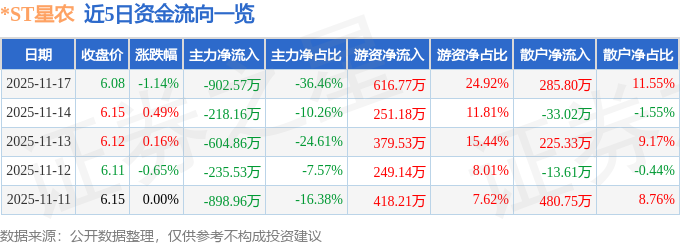 证券之星消息,截至2025年11月17日收盘,*ST星农(603789)报收于6.08元,下跌1.14%,换手率1.56%,成交量4.06万手,成交额2475.36万元。