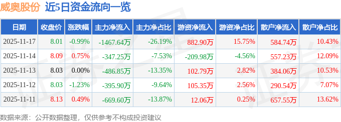 证券之星消息,截至2025年11月17日收盘,威奥股份(605001)报收于8.01元,下跌0.99%,换手率1.77%,成交量6.97万手,成交额5604.27万元。