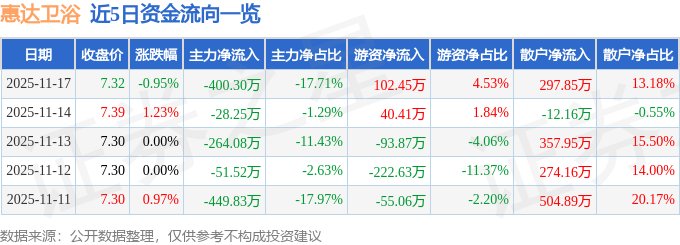 证券之星消息,截至2025年11月17日收盘,惠达卫浴(603385)报收于7.32元,下跌0.95%,换手率0.81%,成交量3.08万手,成交额2260.31万元。