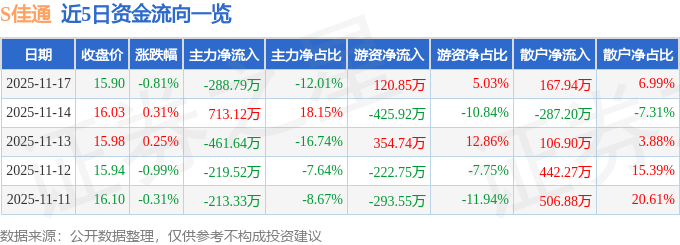 证券之星消息,截至2025年11月17日收盘,S佳通(600182)报收于15.9元,下跌0.81%,换手率0.89%,成交量1.51万手,成交额2404.15万元。