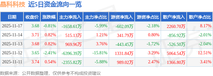 证券之星消息,截至2025年11月17日收盘,晶科科技(601778)报收于3.68元,下跌0.81%,换手率2.11%,成交量75.5万手,成交额2.77亿元。