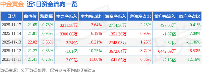 证券之星消息,截至2025年11月17日收盘,中金黄金(600489)报收于21.65元,下跌0.73%,换手率1.17%,成交量56.48万手,成交额12.16亿元。