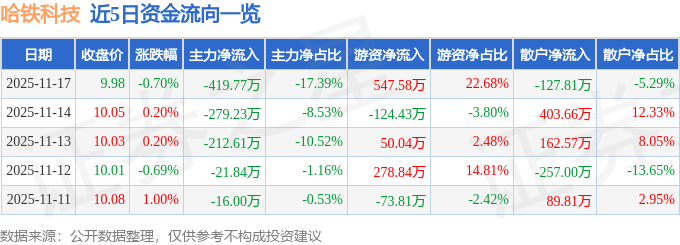 证券之星消息,截至2025年11月17日收盘,哈铁科技(688459)报收于9.98元,下跌0.7%,换手率1.37%,成交量2.41万手,成交额2414.26万元。