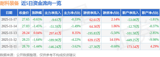 证券之星消息,截至2025年11月17日收盘,耐科装备(688419)报收于27.65元,下跌0.65%,换手率1.78%,成交量1.06万手,成交额2927.62万元。