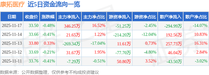 证券之星消息,截至2025年11月17日收盘,康拓医疗(688314)报收于33.5元,下跌0.48%,换手率0.77%,成交量6257.0手,成交额2095.89万元。