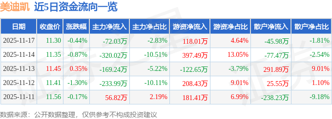 证券之星消息,截至2025年11月17日收盘,美迪凯(688079)报收于11.3元,下跌0.44%,换手率0.56%,成交量2.24万手,成交额2541.06万元。
