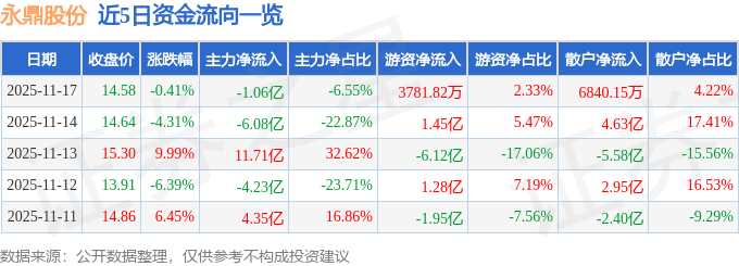 11月17日的资金流向数据方面,主力资金净流出1.06亿元,占总成交额6.55%,游资资金净流入3781.82万元,占总成交额2.33%,散户资金净流入6840.15万元,占总成交额4.22%。