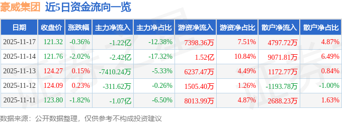 11月17日的资金流向数据方面,主力资金净流出1.22亿元,占总成交额12.38%,游资资金净流入7398.36万元,占总成交额7.51%,散户资金净流入4797.72万元,占总成交额4.87%。