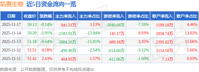 证券之星消息,截至2025年11月17日收盘,凯赛生物(688065)报收于50.13元,下跌0.14%,换手率0.93%,成交量5.44万手,成交额2.69亿元。