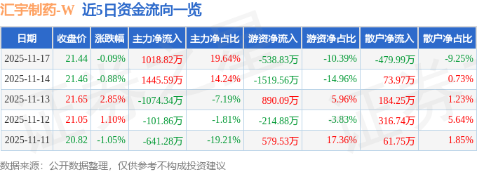 证券之星消息,截至2025年11月17日收盘,汇宇制药(688553)报收于21.44元,下跌0.09%,换手率0.71%,成交量2.45万手,成交额5187.87万元。