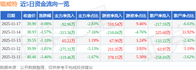 11月17日的资金流向数据方面,主力资金净流出92.96万元,占总成交额2.83%,游资资金净流入310.54万元,占总成交额9.46%,散户资金净流出217.59万元,占总成交额6.63%。
