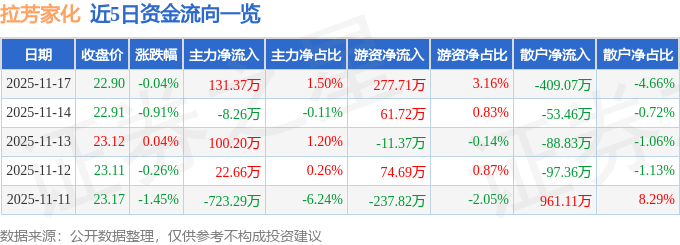 证券之星消息,截至2025年11月17日收盘,拉芳家化(603630)报收于22.9元,下跌0.04%,换手率1.7%,成交量3.83万手,成交额8784.87万元。