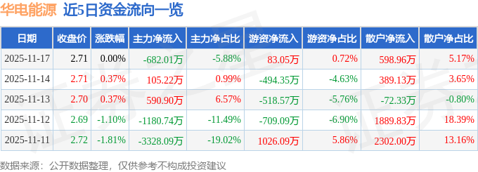 证券之星消息,截至2025年11月17日收盘,华电能源(600726)报收于2.71元,上涨0.0%,换手率1.57%,成交量43.14万手,成交额1.16亿元。