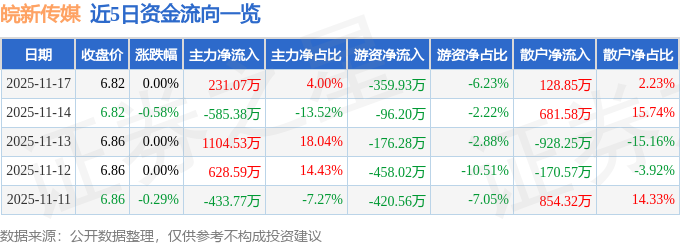 证券之星消息,截至2025年11月17日收盘,皖新传媒(601801)报收于6.82元,上涨0.0%,换手率0.43%,成交量8.5万手,成交额5778.8万元。
