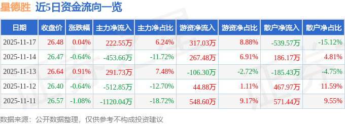 证券之星消息,截至2025年11月17日收盘,星德胜(603344)报收于26.48元,上涨0.04%,换手率2.5%,成交量1.35万手,成交额3568.72万元。