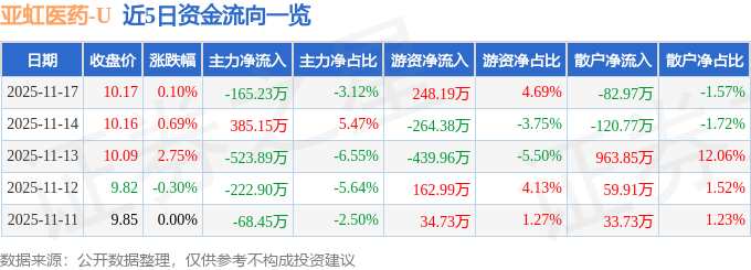 证券之星消息,截至2025年11月17日收盘,亚虹医药(688176)报收于10.17元,上涨0.1%,换手率1.19%,成交量5.2万手,成交额5290.6万元。