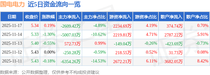 证券之星消息,截至2025年11月17日收盘,国电电力(600795)报收于5.34元,上涨0.19%,换手率0.56%,成交量100.75万手,成交额5.33亿元。