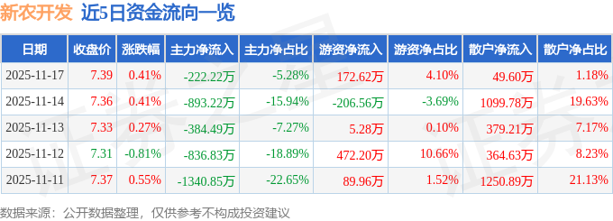 证券之星消息,截至2025年11月17日收盘,新农开发(600359)报收于7.39元,上涨0.41%,换手率1.5%,成交量5.71万手,成交额4207.79万元。