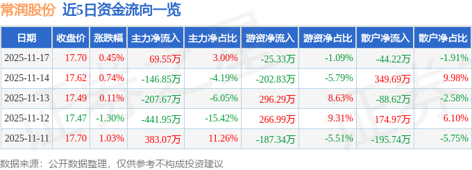 证券之星消息,截至2025年11月17日收盘,常润股份(603201)报收于17.7元,上涨0.45%,换手率0.7%,成交量1.31万手,成交额2317.1万元。